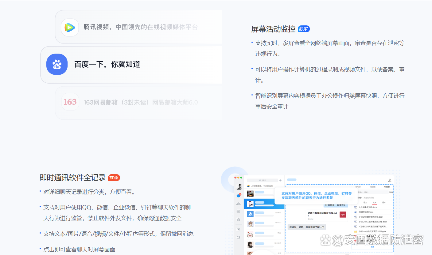 聊天记录监控可以监控员工使用各种聊天工具的聊天内容,网络活动监控能让企业了解员工在网络上的行为,比如访问了哪些网站、下载上传了哪些文件等,全方位保障企业信息安全。
