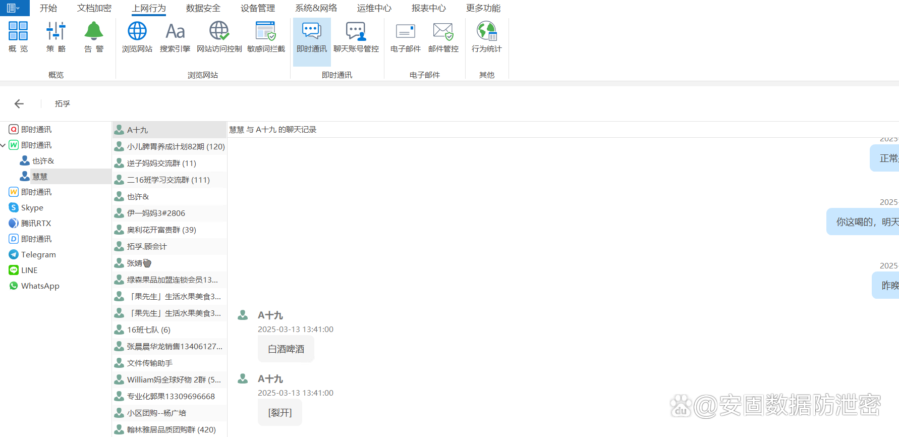 通讯监控:可以监控员工QQ、微信、企业微信等聊天工具的聊天内容,有助于企业掌握员工的沟通情况,防止机密信息通过聊天软件泄露。