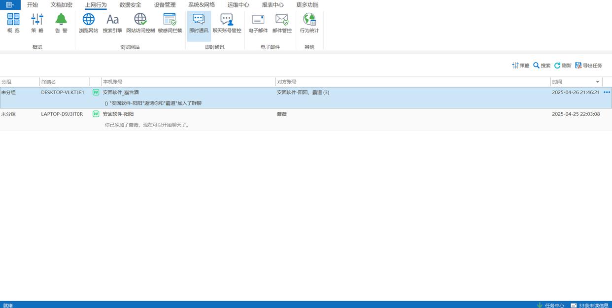 即时通讯软件监控:能详细记录员工在主流即时通讯工具(像 QQ、微信、钉钉、企业微信等)上的聊天内容以及收发文件记录,还能对账号权限进行管控。防止重要信息通过通讯工具泄漏。