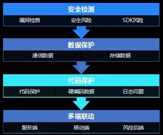 一般而言,移动APP安全的进阶包括四大步骤:安全监测、数据保护、代码保护和多端联动。