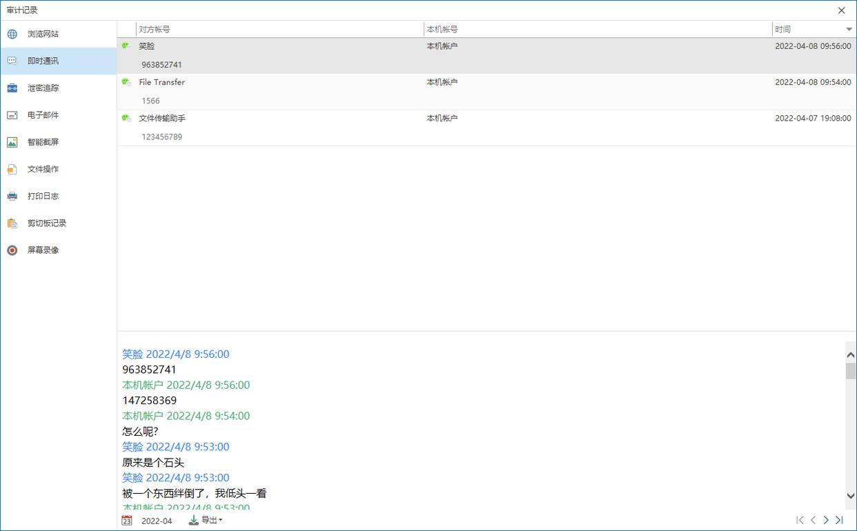 聊天内容监控:无论是文字消息、图片还是文件传输,安固软件都能全面捕捉并保存聊天记录,便于后续审查。这使得企业管理者可以随时检查员工的沟通情况,确保它们符合公司的信息安全政策