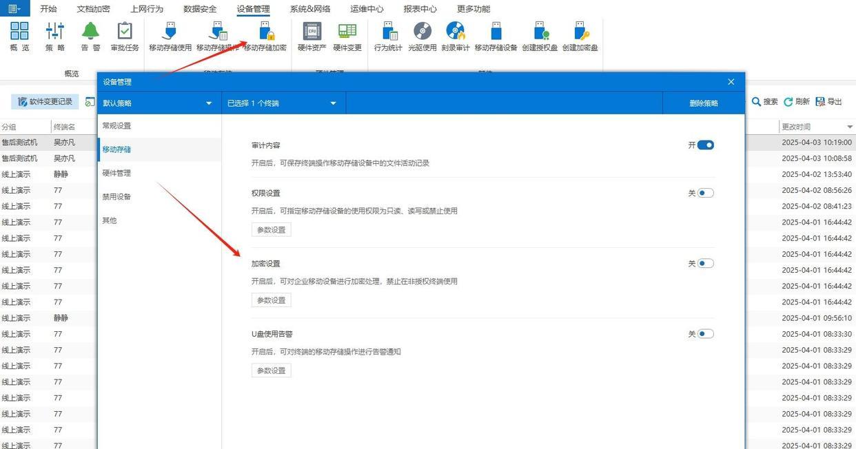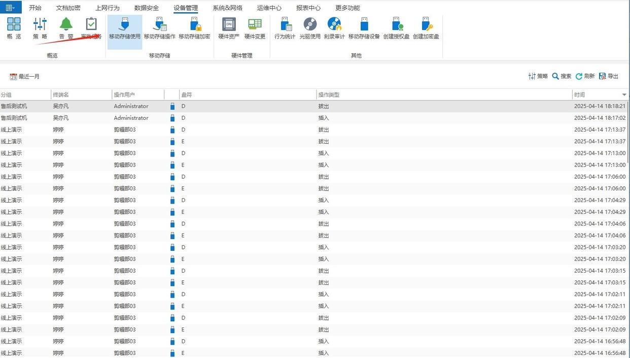 移动存储使用:软件会把 U 盘、移动硬盘等设备,插到公司电脑上和拔下来的时间,全部记录得明明白白。不管是谁在什么时候用了移动存储设备,一查记录就能清楚知道,方便公司了解设备使用情况。