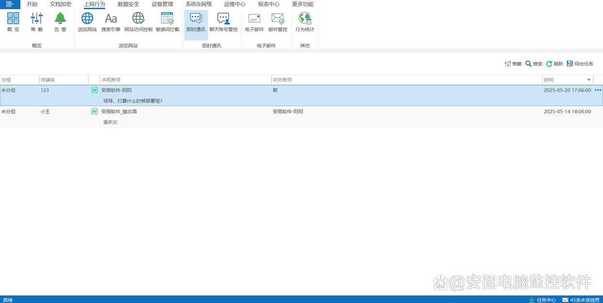 支持对主流的即时通讯工具(如微信、QQ、企业微信、钉钉等)的聊天内容进行监控,能够记录聊天双方的对话文本、发送的文件、图片等信息。