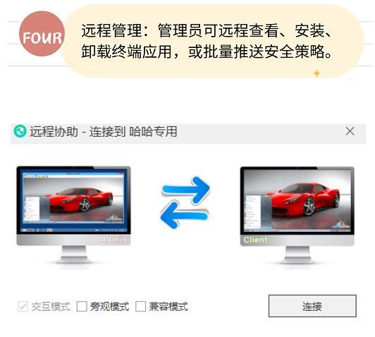 远程协助:管理员可以远程操作终端电脑,在远程协助窗口可以选择交互模式、旁观模式或兼容模式。
