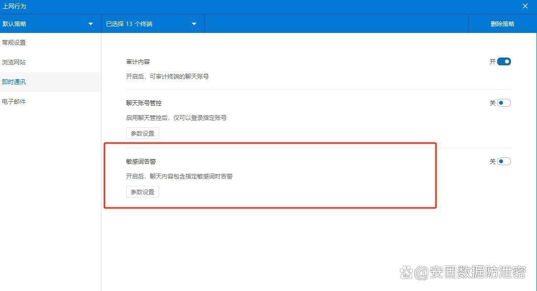 可以设置敏感词词库,一旦对话内容包含了提前设置好的敏感词,如:帐号、离职、工资等,管理员则会及时收到报警通知。