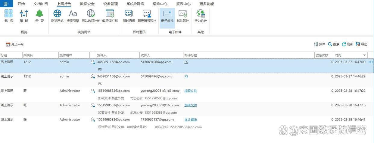 能对收发电子邮件的行为进行过滤和监管,并记录邮箱的收发邮件的标题、收件人、发件人、正文、附件等内容。