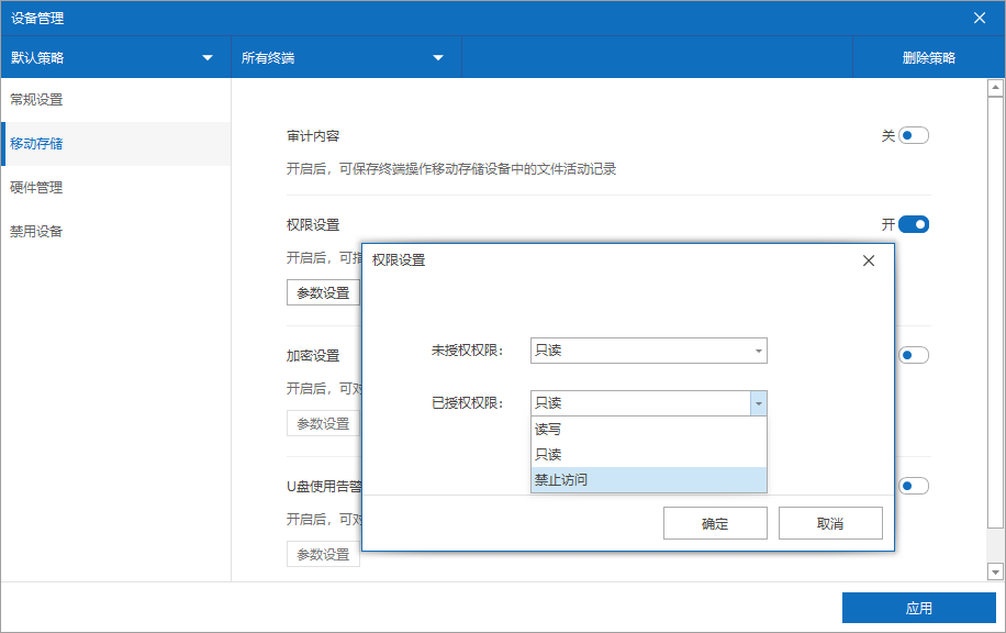 开启权限设置策略,开启后,可指定移动存储设备的使用权限为读写、只读和禁止使用。支持U盘授权,你可以为指定已授权U盘独立设置使用权限。点击参数设置,设置已授权和未授权移动存储设备的使用权限。