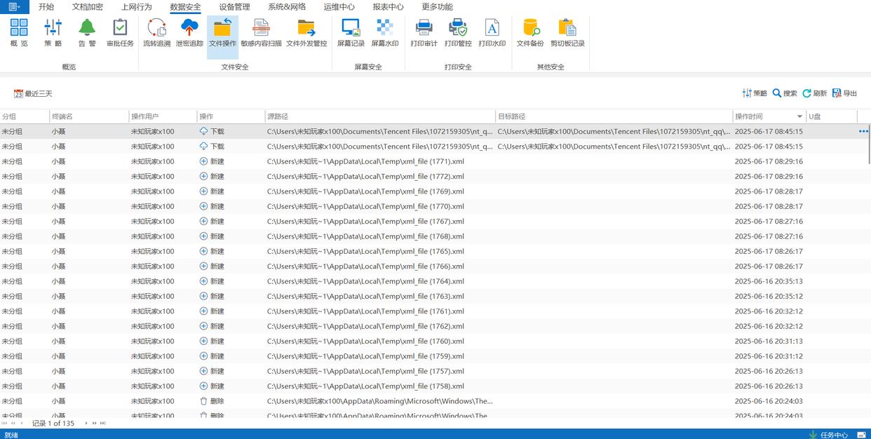 文档全生命周期追踪:记录文件创建、编辑、复制、删除等所有操作,支持按员工+时间+文件类型多维检索。
