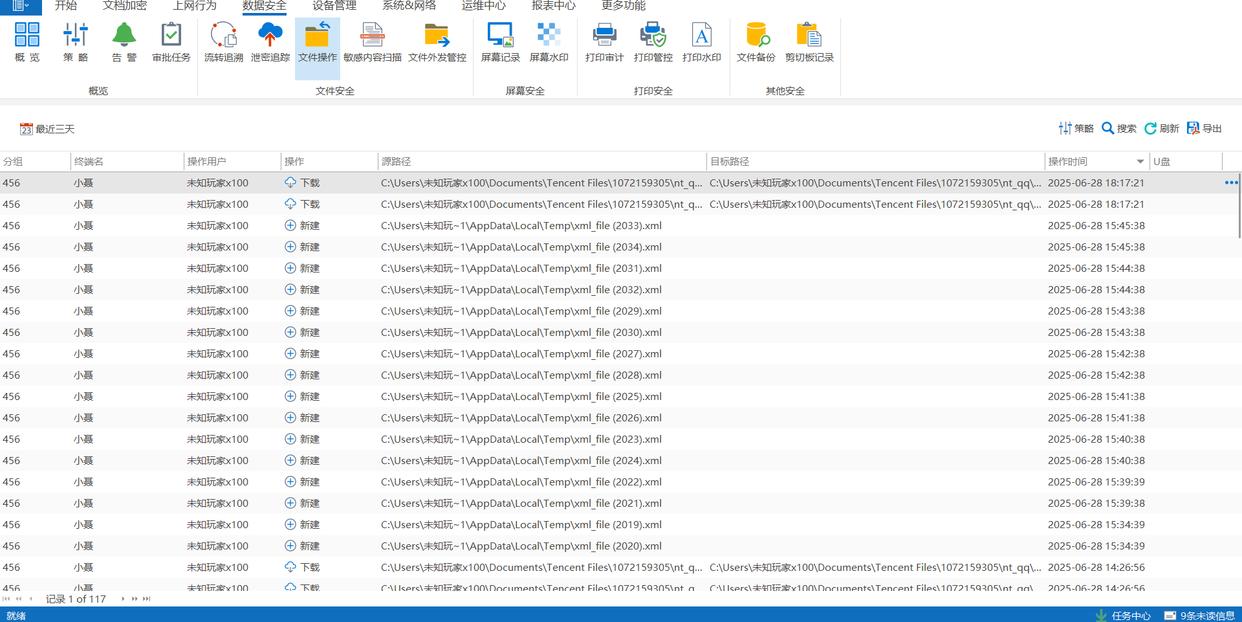 文档全生命周期追踪:记录文件创建、编辑、复制、删除等所有操作,支持按员工+时间+文件类型多维检索。