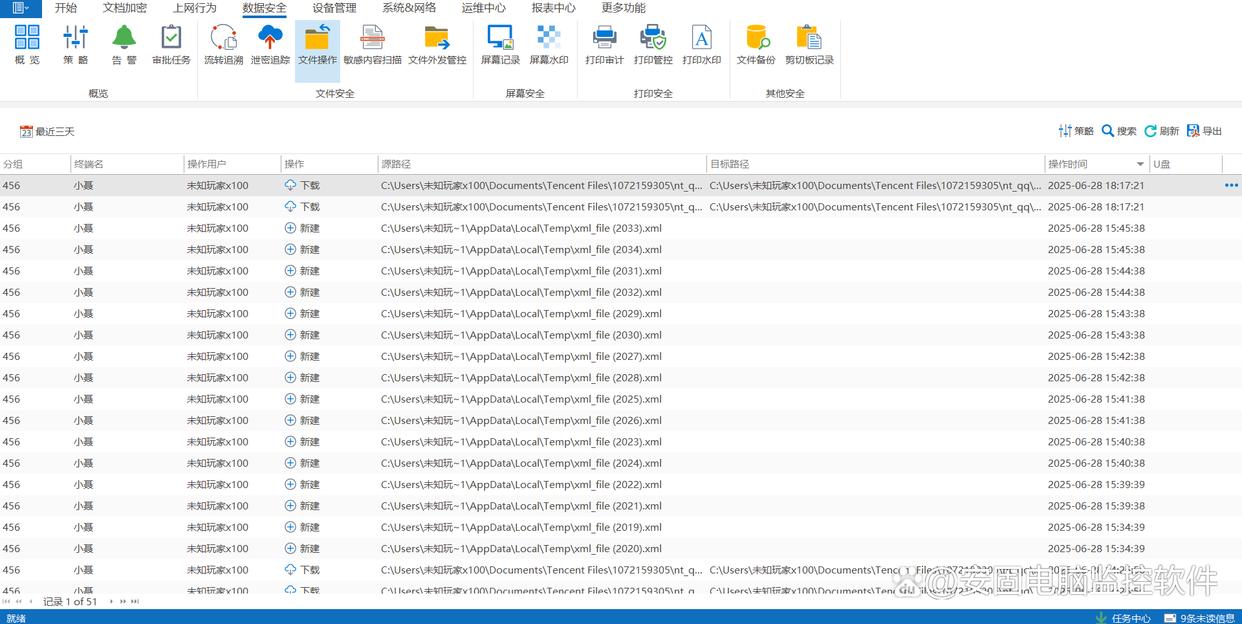 记录文件的创建、修改、删除、复制、移动等操作,支持按文件名、路径、时间筛选。 防止数据泄露,追踪文件流向,确保合规性。