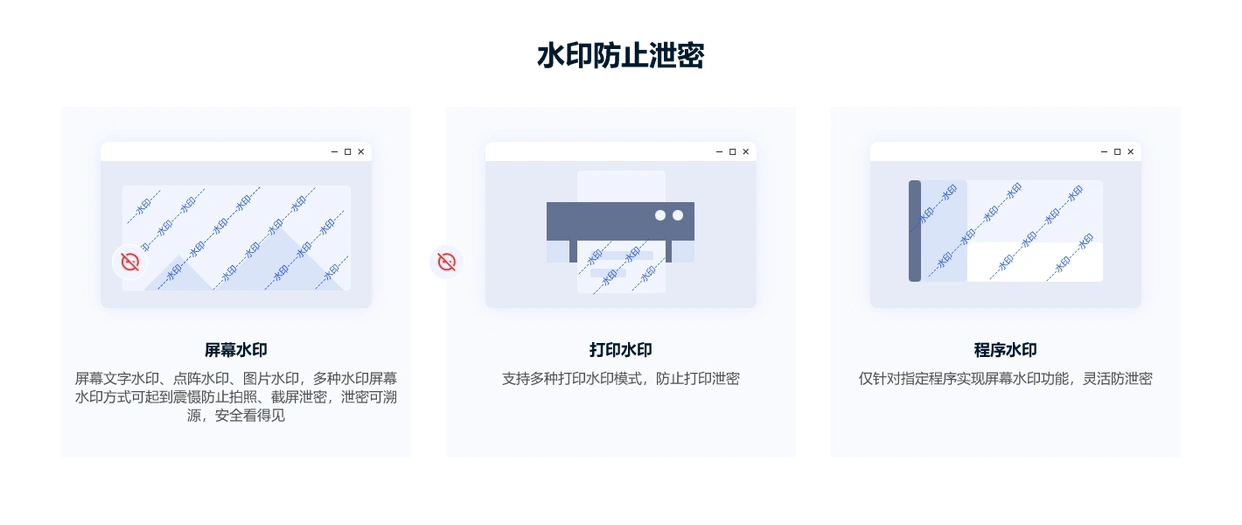 在员工屏幕上动态显示姓名、IP等信息,拍照泄密时可快速溯源。
