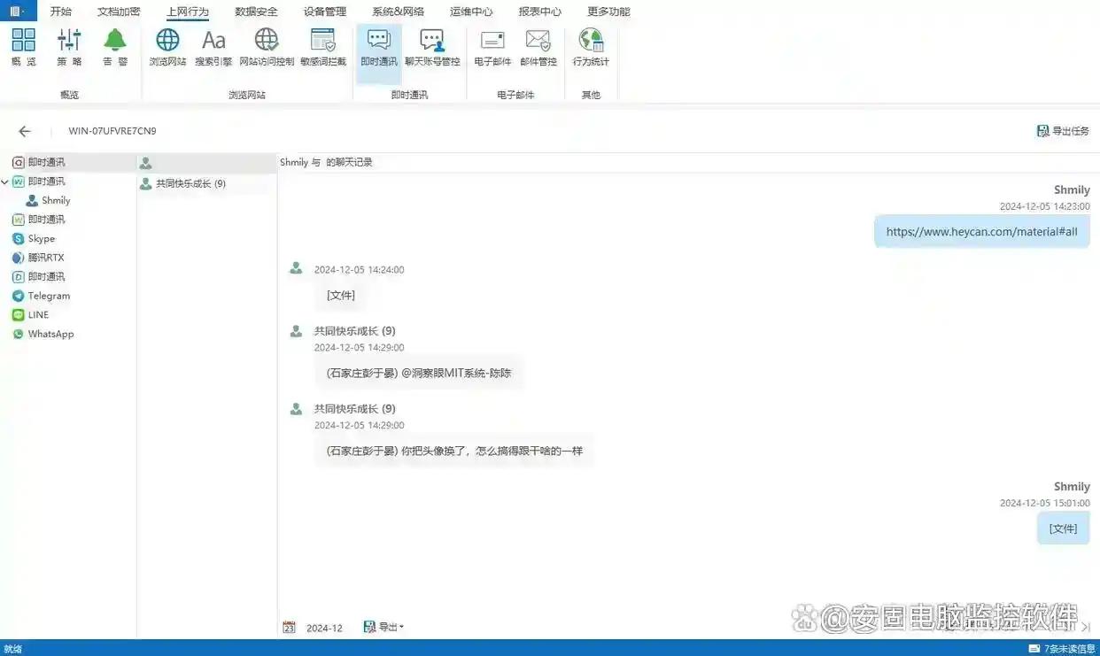 聊天内容监控:支持对微信、QQ、企业微信、钉钉等常用聊天工具的聊天内容进行监控,记录聊天内容、时间、收发对象等信息,有助于企业了解员工沟通情况,防止通过聊天工具泄露企业机密。