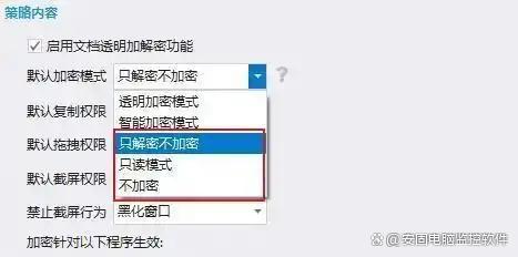 软件支持多种透明加密模式,包括透明加密、智能加密、落地加密、只解密不加密、不加密以及只读、复制和剪贴板加密。