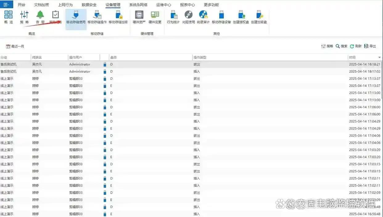 U盘插拔记录:软件可以详细记录U盘的插拔情况,包括U盘的型号、插入时间、拔出时间等信息,方便管理员随时监控U盘的使用动态。