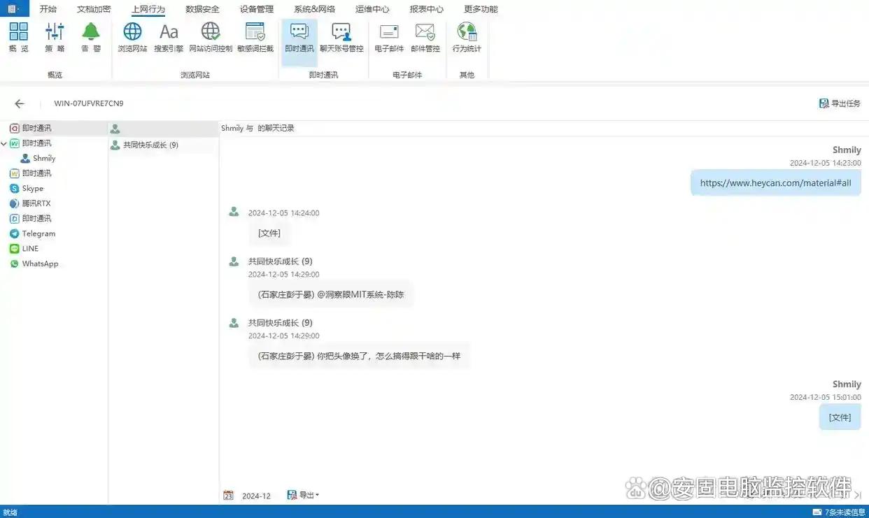 聊天内容监控:支持对微信、QQ、企业微信、钉钉等常用聊天工具的聊天内容进行监控,记录聊天内容、时间、收发对象等信息,有助于企业了解员工沟通情况,防止通过聊天工具泄露企业机密。