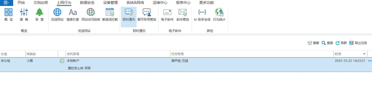聊天内容监控:支持对微信、QQ、企业微信、钉钉等常用聊天工具的聊天内容进行监控,记录聊天内容、时间、收发对象等信息,有助于企业了解员工沟通情况,防止通过聊天工具泄露企业机密。