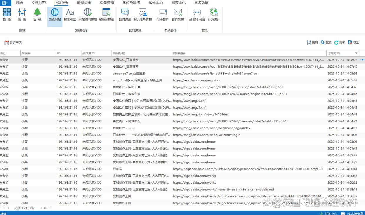 网络浏览记录:记录员工访问过的每一个网站,从网址、访问时间到停留时长,都被清晰记录。企业可根据此数据,限制员工访问娱乐、赌博等无关网站,避免员工分心。