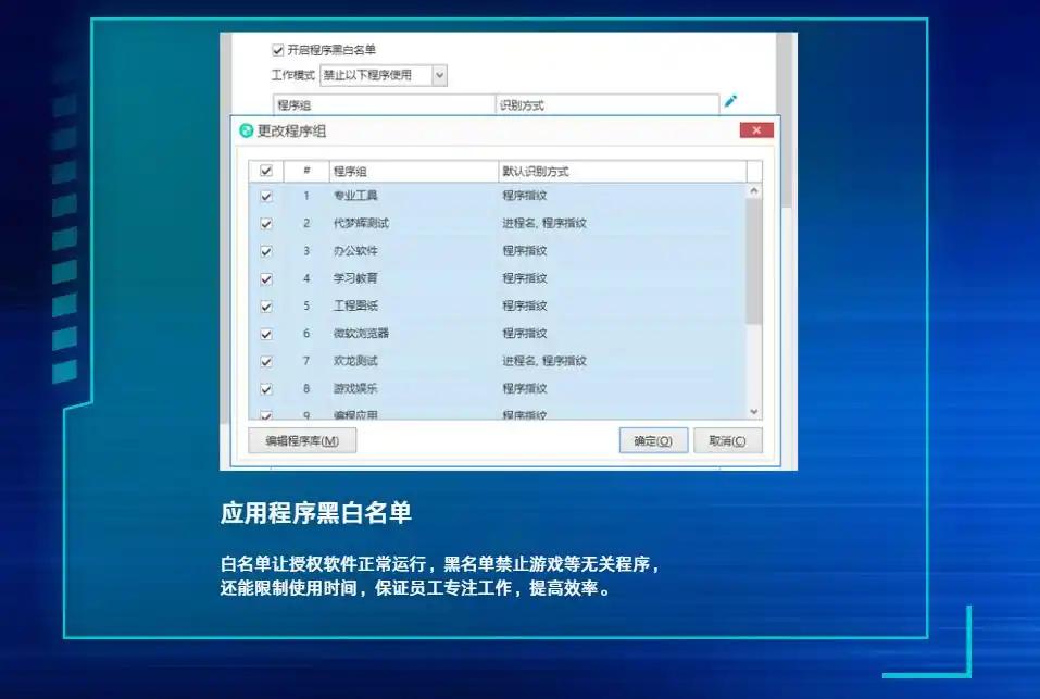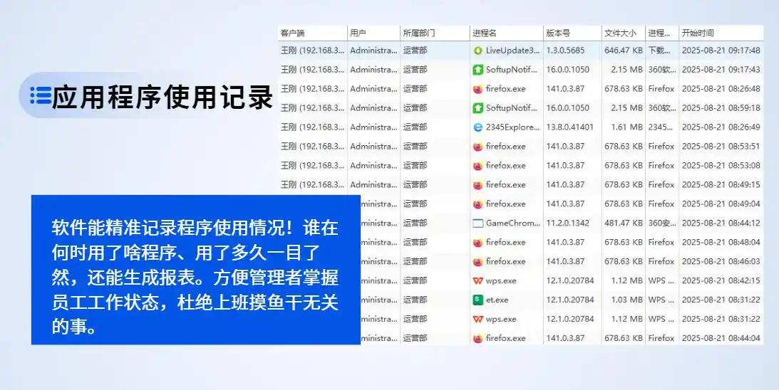 5.应用程序使用监控:统计员工使用各类软件的时间和频率,生成使用报告。帮助企业了解软件资源分配是否合理,及时发现并限制非工作软件的过度使用。