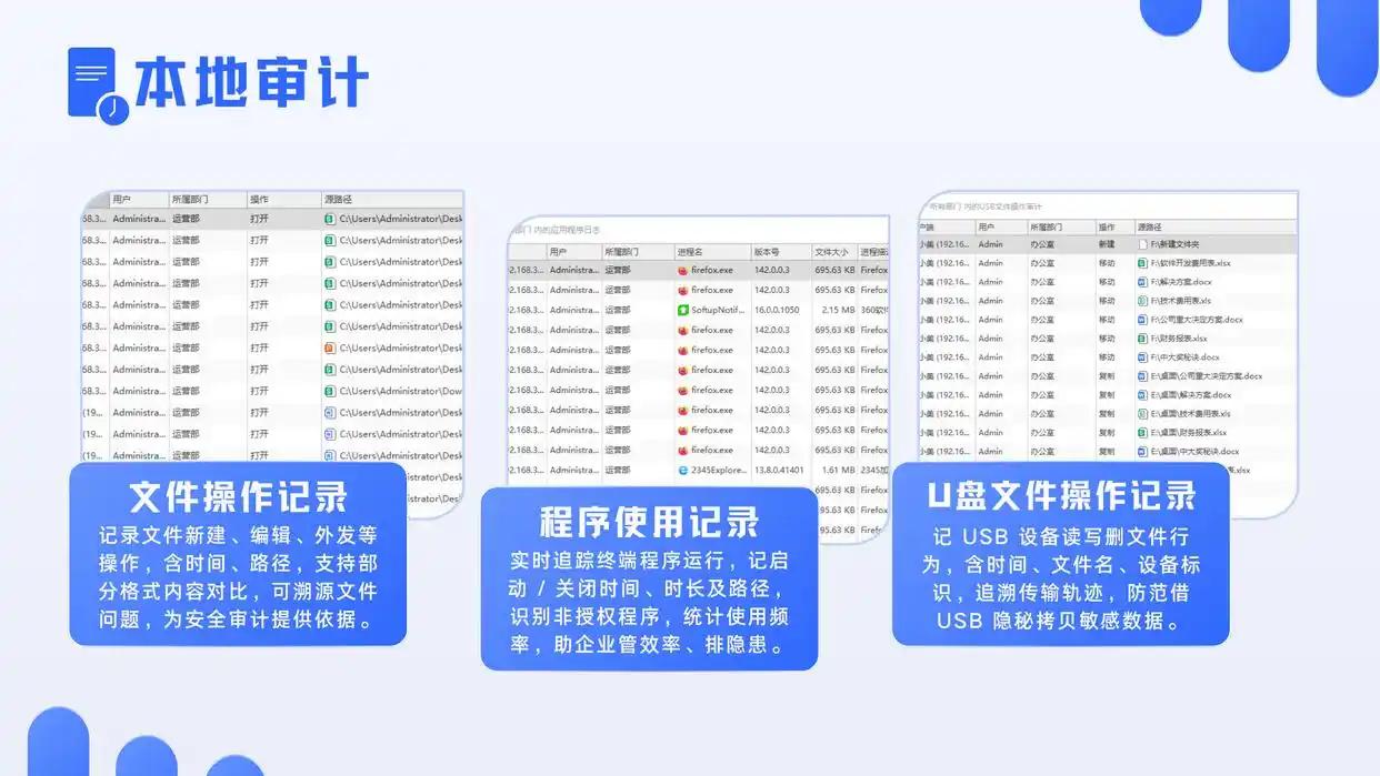 4.文件操作审计:详细记录文件的创建、复制、修改、删除以及通过U盘、邮件、即时通讯等途径的外发行为。一旦发生数据泄露,可以快速定位源头,追查责任人。