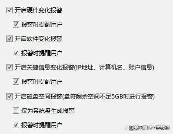 支持对硬件异动、磁盘空间不足、私自拆卸硬盘、软件变化、网络配置变更进行报警。