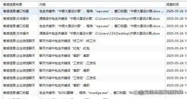 智能风控:预设敏感词库(如“薪资”“竞品”),触发报警时自动截图并推送至管理员。