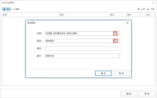 点击参数设置,点击添加按钮,设置禁止指定程序外发文件,可自定义添加程序,设定禁止全部文件或复合规则文件拒绝外发或允许外发。