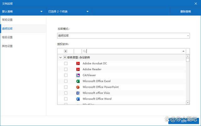 选择透明加密或半透明加密加密模式后,在下方授权软件列表中,勾选可以透明加解密的软件,点击应用,下发策略。