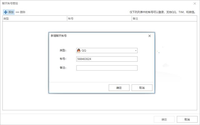 开启聊天帐号管控策略,开启后,终端仅可以登录指定帐号,支持QQ、微信和TIM帐号。点击参数设置,点击页面左上角添加按钮,添加白名单聊天帐号,选择类型QQ或微信、填写帐号、备注信息。