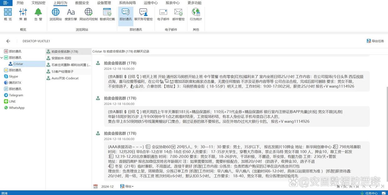 即时通讯工具和其他网络渠道传输的数据,确保没有未经授权的敏感信息外流。