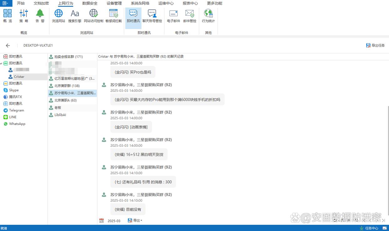 安固:支持对多种主流即时通讯工具进行监控,提供实时监控、预警以及远程管理等功能。其强大的实时监控功能能够全方位、无死角地监控员工的电脑操作。