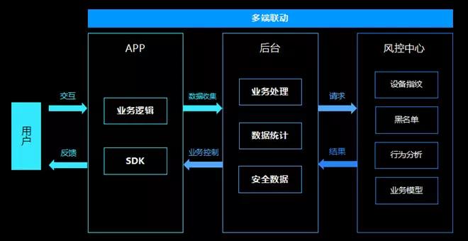对于APP、后台、风控中心这三者来说,APP通过和用户交互获取数据,后台通过手机数据向风控中心提出安全请求,风控中心再通过设备指纹、黑名单、行为分析和业务模型向后台反馈结果,后台通过业务调整控制APP业务,并最终呈现给用户。