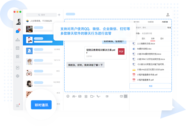 支持对用户使用主流即时通讯软件的聊天行为进行监管,记录双方聊天对话及文件传输,确保沟通数据安全。